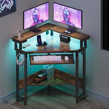 Triângulo Canto Gaming Desk com Tomadas de Energia & Luzes LED, Pequeno Espaço Canto Workstation com Monitor Stand & Teclado Bandeja