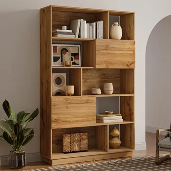 ตู้หนังสือไม้5ชั้น68 "H พร้อมประตูชั้นวางของรูปทรงเรขาคณิตที่ทันสมัยพร้อมช่องปรับระดับได้สำหรับห้องนั่งเล่นและห้องเรียน
