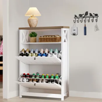 16 - Pairs Tipping Bucket Shoe Storage Cabinet with 2 Open Storage Shelves for Entryway